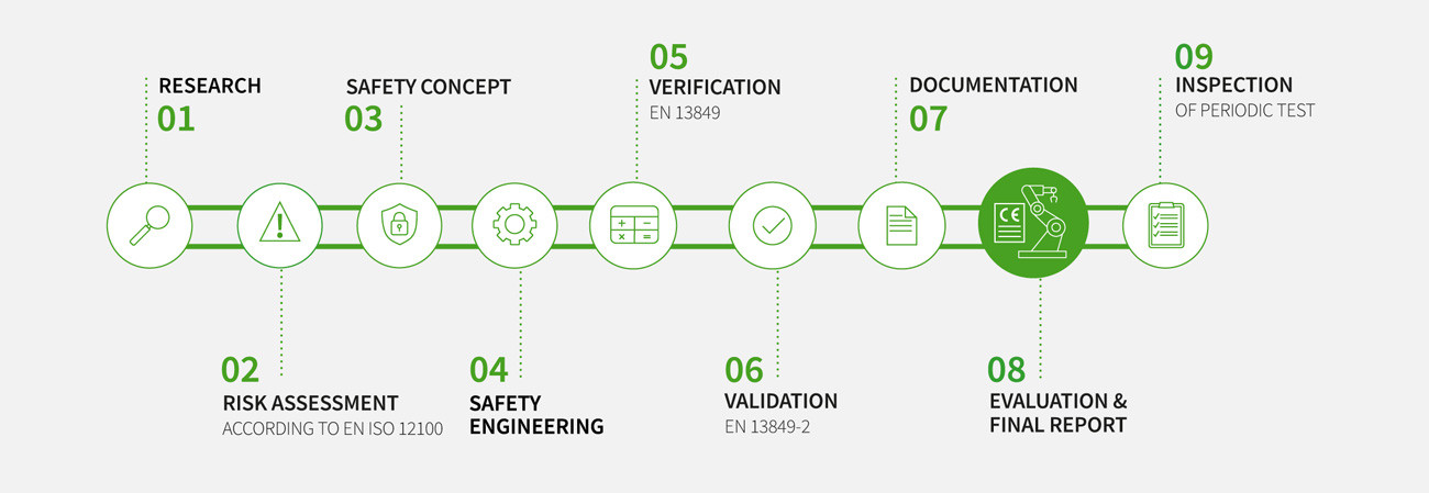 Nous sommes là pour vous aider à chaque étape vers la réalisation d'une machine sûre : depuis l'évaluation des risques, l'élaboration du concept de sécurité et la sélection des composants de sécurité appropriés, jusqu'à la vérification de la documentation. Grâce à une approche globale, nous élaborons un programme sur mesure pour répondre à vos besoins en matière de conformité.